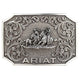 This large scalloped shape buckle by M&F Western Products features an Ariat logo design. The background is detailed with flowers and scrolls with an added filigree to give depth. Accented with a twisted rope trim.