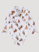 Wild and free is just what every cowgirl ought to be. This little girl's horse romper features a pretty print of a pony with flowers in its mane. It also comes with ruffled sleeves, keyhole back, and snaps at the seat for easy changing when you're on the go. This one-and-done outfit is made of cotton with just a subtle amount of stretch to keep her comfortable all day long.