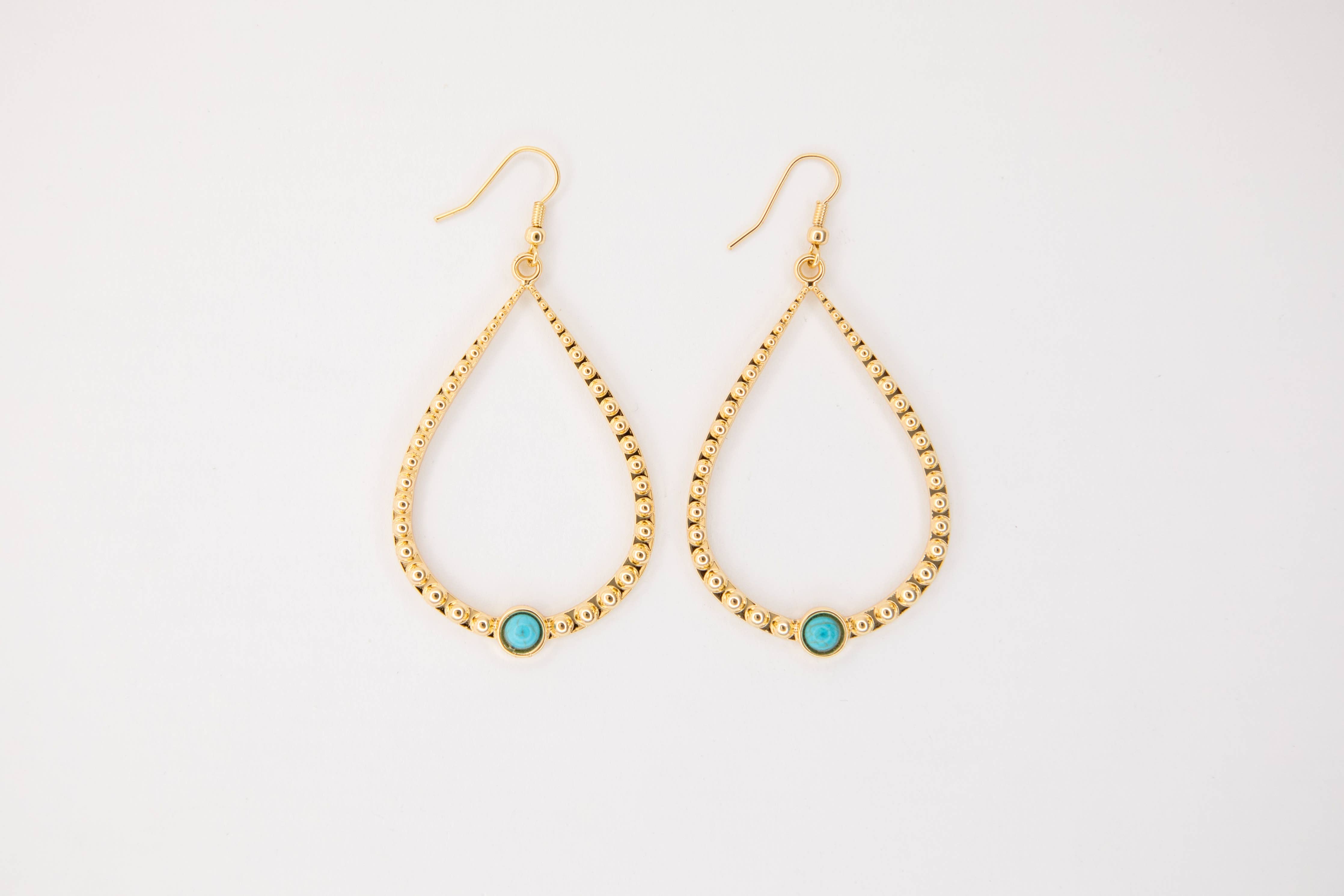 2.25" 18K White Gold Plated Hammered Teardrop Earring on Fishook with Turquoise Accent