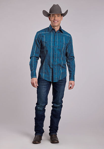 This classic men's long sleeve shirt brings authentic Western style with its striking vertical Aztec print in rich navy tones. Featuring premium construction details including point front yokes, a slightly curved back yoke, and curved pockets with flaps for a refined fit. Durable three-snap cuffs with navy opaque snaps ensure secure closure, while denim inside trim adds durability and authentic character. The garment-washed finish gives it that broken-in, lived-in look perfect for ranch work or weekend wear. A timeless piece that pairs tradition with quality craftsmanship.