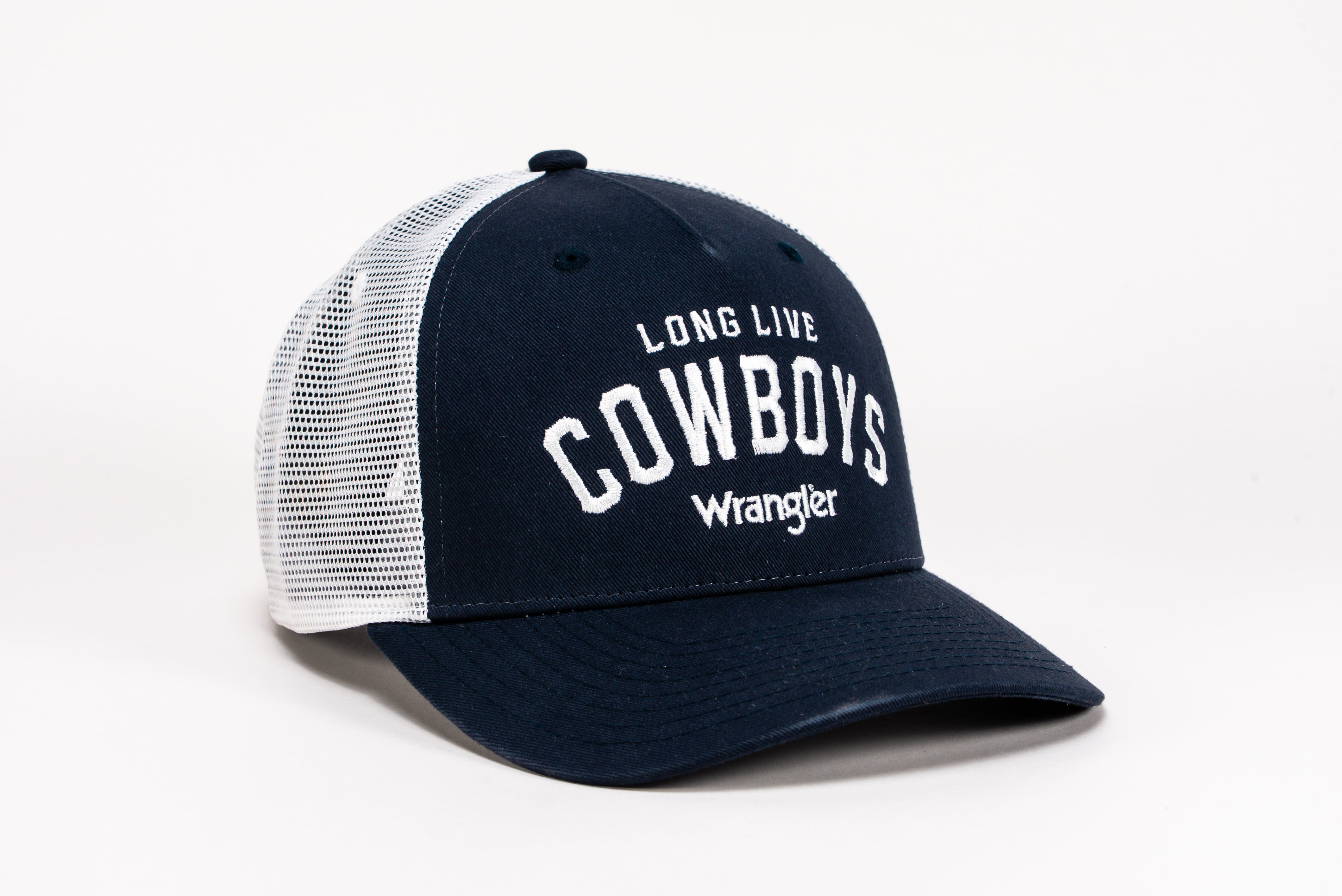 The Wrangler Cowboys Cap features bold embroidered “COWBOYS” lettering beneath a classic “Long Live” arch and Wrangler logo. Available in Navy, Grey, and Khaki, it’s a clean, timeless design that celebrates Western pride.