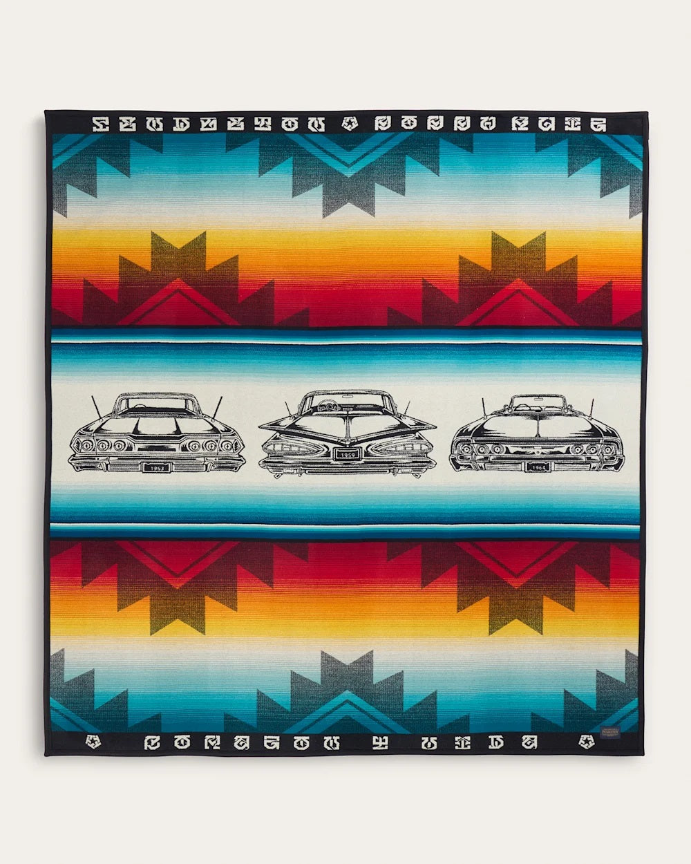 Created in collaboration with Bobby Ruiz, this bold and graphic blanket combines vibrant Pendleton motifs with depictions of classic lowrider cars—one of Ruiz’s passions. Made from wool woven in our American mills, this blanket doubles as functional bedding or standout décor. Finished in classic whipstitched edges.