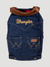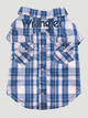 This dark wash denim jacket features the Wrangler® embroidered logo and iconic Wrangler® pocket patch. Faux suede collar detail and buffalo plaid lining with adjustable velcro belly band will keep your dog comfortably in style. Includes an opening near neck for easy lead attachment. Machine washable polyester, cotton, elastane and viscose.