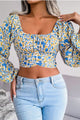 Lantern Sleeve Bow Floral Chiffon Crop Blouse Blue