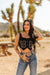 This solid stretch suede corset crop top features button-down closure, detailed boot stitch embroidery, and distinctive concho buttons for a refined, western-inspired look..
