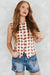 This brown and ivory gingham top features a flattering tailored fit, contoured hem, vintage western-style buttons, and an adjustable back tie detail for customizable shaping. Perfect for pairing with denim, skirts, or layered under jackets, this sleeveless blouse delivers effortless versatility from rodeo nights to everyday wear.