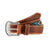 This belt features natural leather from Brazil and basketweave embossing crafted with a solid brass embossing die from Italy. The chevron design is hand-painted in three colors.
