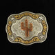 Beautifully designed buckle by M&F Western Products. Oval buckle with an antique gold praying cowboy and horse motif with an antique silver cross. Scrolling accents in copper around the motif. Accented with a beaded edge.