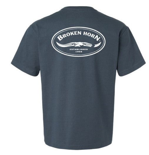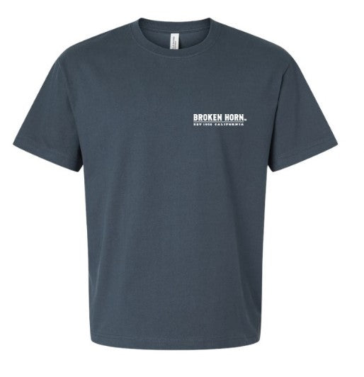 Ride into comfort with the Broken Horn Logo Heavyweight Tee, featuring a boxier, relaxed fit that suits every cowboy and cowgirl. Its drop shoulders and sturdy shoulder taping keep you carefree on the trail, while the double-stitched 3/4” neckband holds up like your favorite worn-in hat. With side seams for a trusty fit and a tear-away label for itch-free wear, this tee blends rugged Western style with all-day ease—perfect for rustling cattle or kicking back by the campfire.