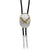 The simply elegant design of this horse head bolo tie transitions easily between casual and formal wear. The tall oval slide is trimmed with a fine gold twisted rope around silver filigree engraving from edge to edge with two floral flourishes placed opposite at the top and bottom. A gold figure of a flying eagle is applied to the center. The black braided leather cord is nicely weighted with two silver arrow pointed tips.