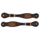 Men's flared spur straps are handrafted from premium buttered Canyon Rose harness leather and feature pewter spots and floral stainless steel buckles.