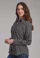 Made of 100% cotton poplin, this women's shirt features an ombre Aztec print and is designed with a 1 point front yoke, a slightly curved back yoke, and curved pockets and flaps. The denim inside trim and opaque snap front add a touch of style while the waist and bust darts provide a flattering fit. With a garment washed finish and 3 snap cuff, this shirt is both fashionable and functional.