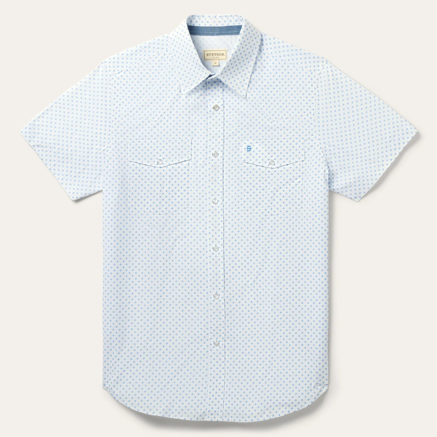 This short-sleeved western shirt is crafted from cool, crisp cotton poplin and features our exclusive silver spur print. It has a one point front and back yokes, the Stetson “S” embroidered on the front left pocket, chambray inside trim and a classic snap front with logo pearl snaps. It’s cut in our Tailored Fit, a versatile style that’s slightly tapered at the sides for a streamlined appearance and a shorter length designed to look great tucked or untucked.