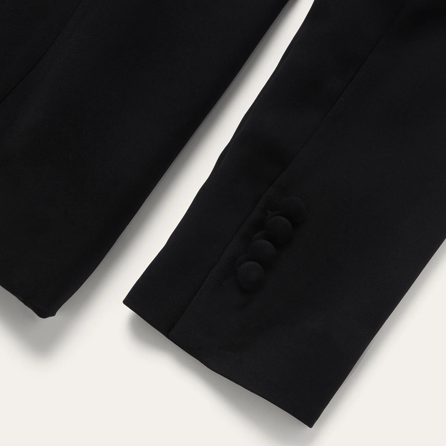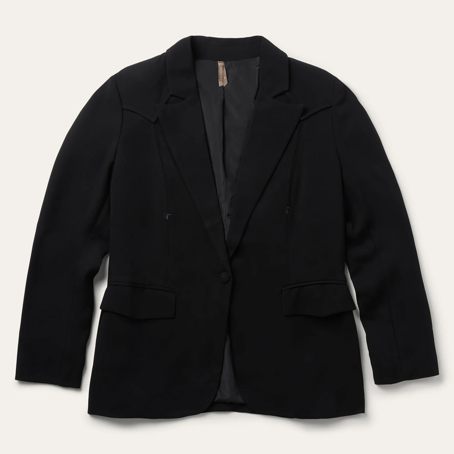 Timeless and refined, the Western Blazer is crafted from a smooth, high-quality crepe blend that offers a soft handfeel and elegant drape. It features distinctive western tailoring, with a single-point curved front yoke, double-point curved back yoke, and arrow-point detailing at the princess seams. Designed with a notch collar, single-button closure, and a center back vent, it’s finished with welt and flap pockets, buttoned cuffs, and shaping darts for a flattering silhouette that moves with ease from day to evening.