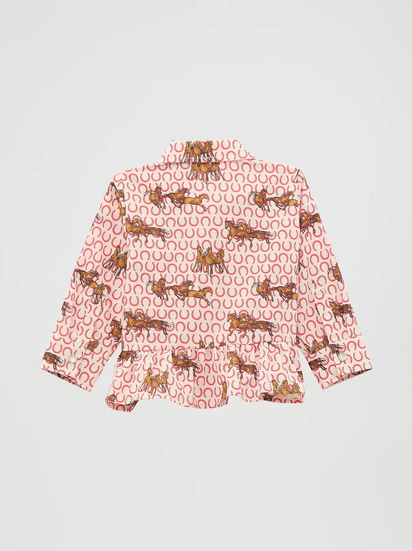 Every budding young cowgirl needs an authentic Western snap shirt. This one comes with all the classic elements you love: single-point yokes, pearl snaps, and two chest flap pockets with the ‘W’ stitching. Best of all, it’s finished with a ruffle hem that will add tons of personality to her outfits. It’s crafted from a comfy cotton blend she can wear at any time of year, with a pretty print full of horses and horseshoes.
