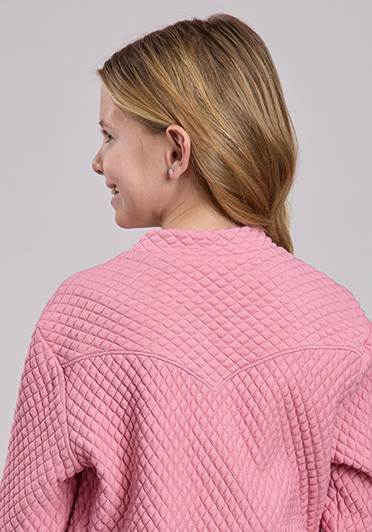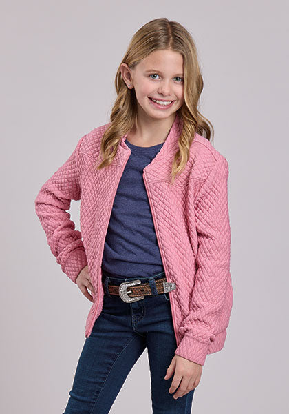 Saddle up in style with this charming pink quilted bomber jacket, perfect for any young cowgirl. Featuring long sleeves and a full zip front for easy layering, this jacket combines comfort with that classic Western flair. Practical side seam pockets keep essentials within reach, while elastic hems at the bottom and cuffs ensure a snug, flattering fit. Whether she's heading to the ranch or town, this versatile piece delivers warmth and Western charm in one adorable package.