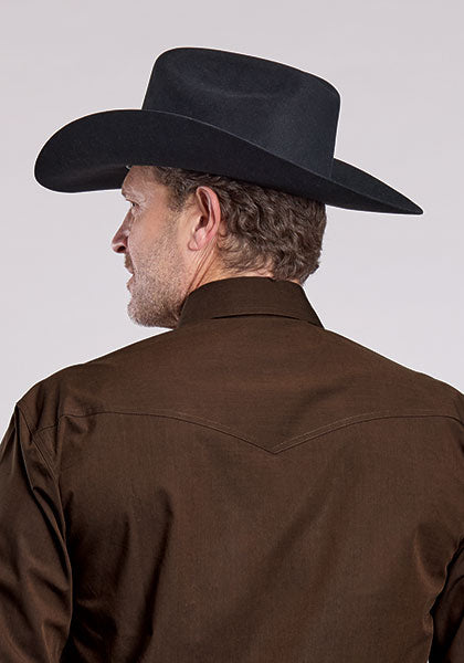 Built for the working cowboy, this brown poplin roper shirt combines traditional Western styling with practical functionality. The snap front opens effortlessly, while contoured yokes at front and back provide a tailored fit that moves with you. Two spacious chest pockets with curved flaps keep essentials within reach, and triple-snap cuffs secure your sleeves tight. The embroidered roper "R" badge signals your commitment to authentic Western wear. Whether you're working cattle, hitting the arena, or simply embracing ranch life, this shirt delivers the durability and style that defines true cowboy character.