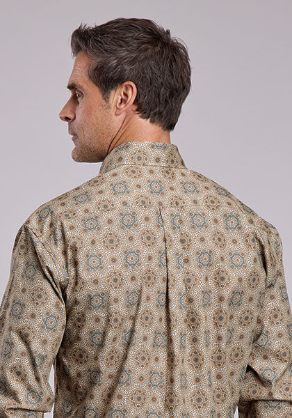 Saddle up in timeless Western style with the Stetson Gold Coin Medallion shirt. This classic cotton poplin features an eye-catching allover print that captures authentic ranch heritage. The straight back yoke with pleats ensures a comfortable fit, while signature Stetson embroidery adorns the chest and right sleeve placket. Solid poplin trim inside adds refined detail, and adjustable mitered edge cuffs with pearl logo buttons deliver that genuine cowboy aesthetic. Perfect for rodeos, country gatherings, or everyday Western wear.