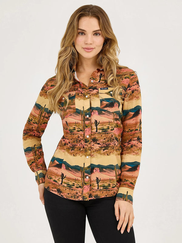 This long-sleeve snap shirt will feel right at home in your closet and be ready to rodeo day or night. This snap shirt features a bold print of desert mesas and made of 100% rayon, this top is incredibly soft to the touch and comfortable enough to wear all day long. Plus, it comes with all the Western influences you know and love, including pointed front and back yokes, snap flap pockets, and pearl snaps.