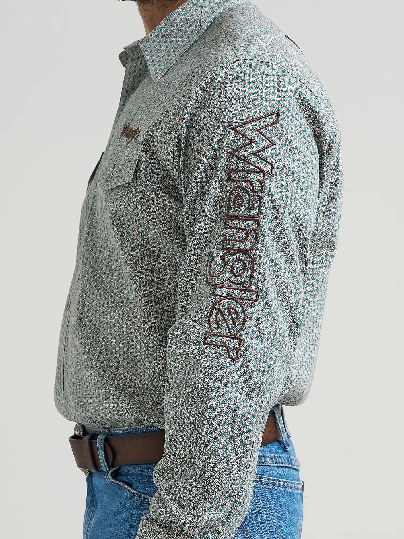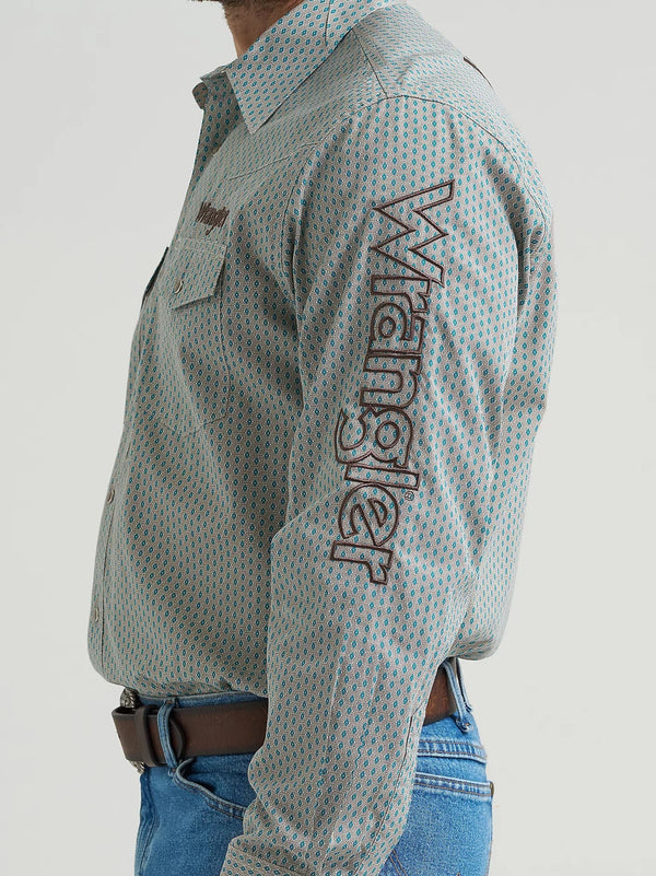 With no shortage of Western credibility, the Wrangler logo long sleeve snap shirt represents a true original in the American west. It comes with all the classic details you've come to know and trust about Wrangler snap shirts, including a spread collar, snap flap pockets with a one-inch pencil slot on the right, a pointed yokein the back, and a 100% cotton construction that's perfect all year long. It also comes with the Wrangler logo above the right pocket, down the left sleeve, and across the back.